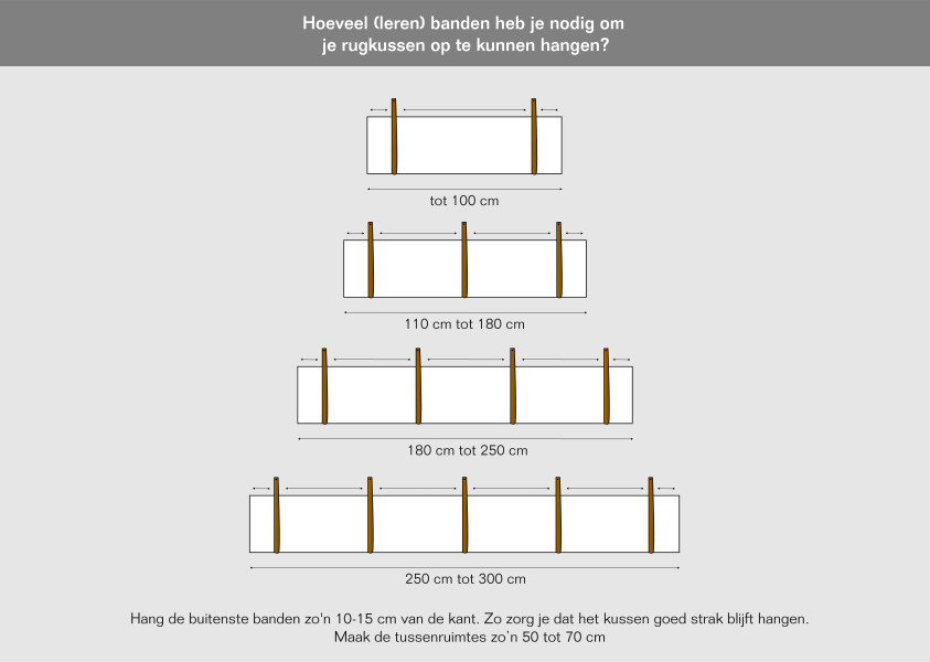 De banden zijn standaard 120 x 4 cm, perfect voor strakke rugkussens tot zo'n 50 cm hoog.